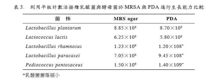 為評估乳酸菌于PDA之生長狀況,本研 究將乳酸菌活化后經(jīng)序列稀釋至適當稀釋倍 數(shù)后以傾注培養(yǎng)于MRSA及PDA,結(jié)果如表 3 所示,乳酸菌以傾注平板法接種于 MRS agar 及 PDA,乳酸菌于兩種培養(yǎng)基皆可生 長,并且其菌落數(shù)目無明顯差異。乳酸菌于 MRSA培養(yǎng)基上生長活性較佳,菌落呈白色 明顯肉眼可見,但由于PDA是霉菌與酵母菌